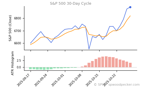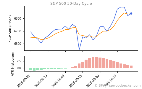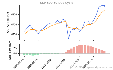 As of October 29, 2025, SPX fell -0.00%. Volatility decreases while remaining positive — this may mark the start of a bullish leg. Price and volatility behave in line with normal expectations for this stage of the cycle.