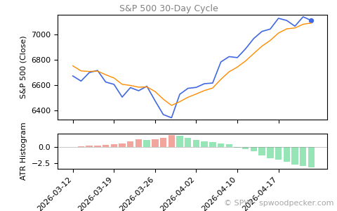 As of April 23, 2026, SPX fell -0.41%. The market is on the bottom stage of the cycle, where traders look for new balance, and volatility is easing.